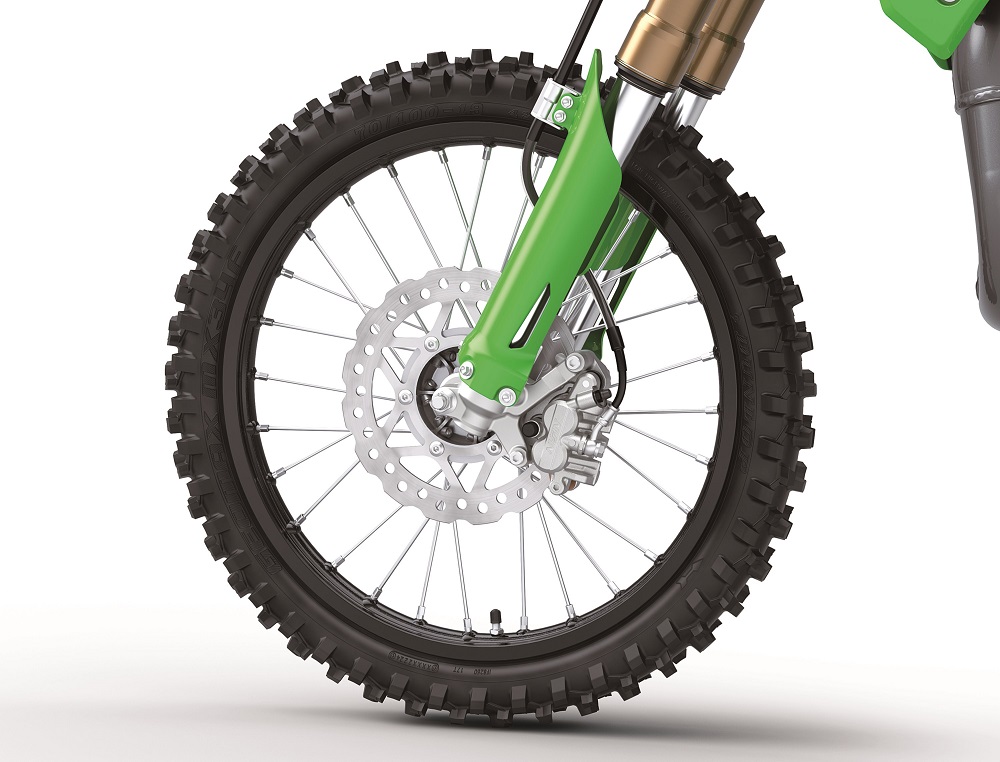 The braking system was inspired directly by Kawasaki’s larger KX machines, delivering powerful, consistent performance. Front and rear petal disc brakes offer strong heat dissipation and enhanced stopping efficiency. Up front, the brake disc diameter has been increased from 220mm to 240mm. Complementing the larger disc, the master cylinder and caliper have been upgraded to KX250-style Nissin units and utilize dual 25mm pistons. These changes significantly improve braking force, durability, and overall modulation, giving riders greater confidence when approaching high-speed braking zones.