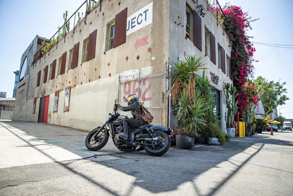 The chassis features geometry that achieves both straight-line stability and neutral handling, and although seat height is low at 27.5 inches, the engine is compact enough to enable a 35-degree bank angle—much more than most cruisers and suitable for spirited cornering. High-performance suspension components comprise a 43 mm conventional fork with a cartridge-type damper, and twin Showa shocks with piggyback reservoirs, while the front brake has a monobloc, four-piston, radial-mount caliper with a floating rotor. Curb weight is just 509 pounds for the DCT version.