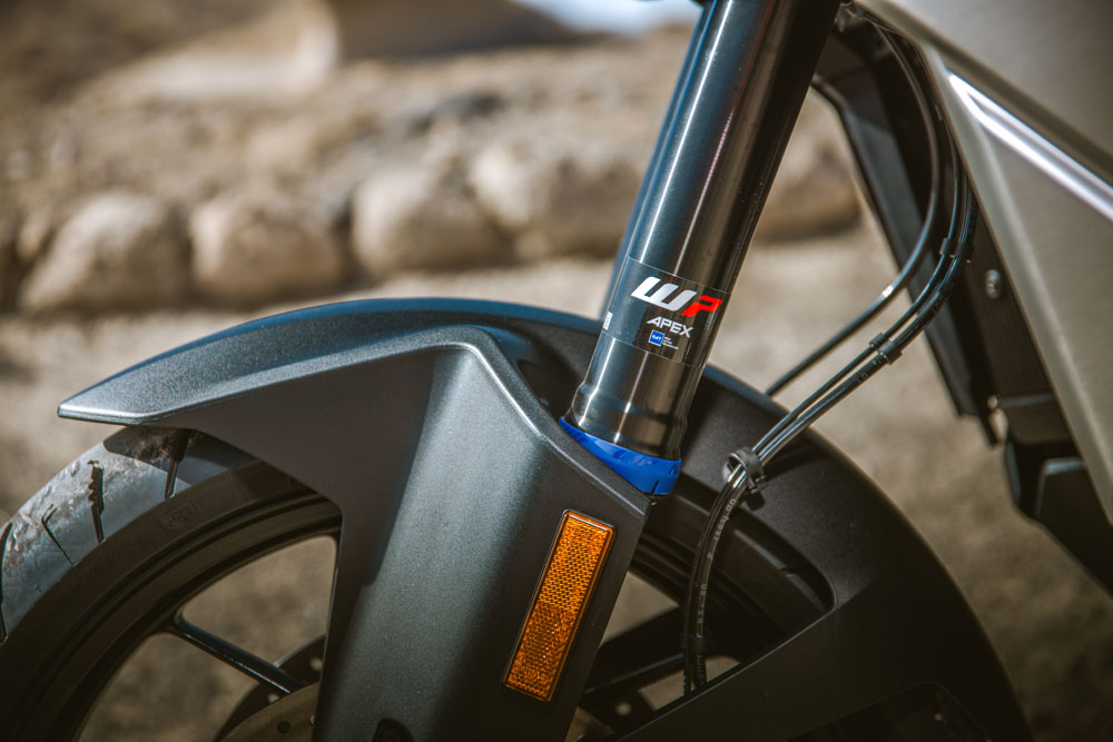 The WP SAT components deserve some attention here, as they have an amazing ability to provide cruising comfort and aggressive performance at the tap of a screen or the push of a button. This new generation of suspension tech now incorporates new stroke speed and travel sensors for finer tuning. Together with a new through-rod fork construction, WP is bringing massive tech to your suspension. This means the Suspension Control Unit can provide real-time damping-rate adjustments via the magnetic valves and opens the door to even more advancements in programming for things like jump detection when we get off-road. Again, get the Tech Pack, and you will have all the options Suspension Pro offers—things like Anti-Dive and full clicker-like compression and rebound adjustments.