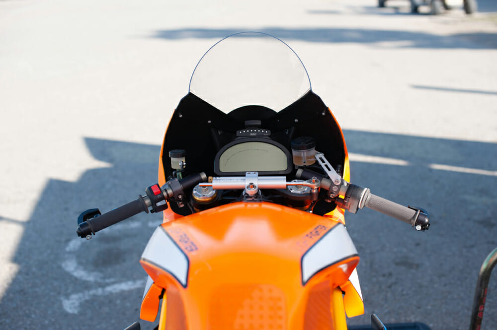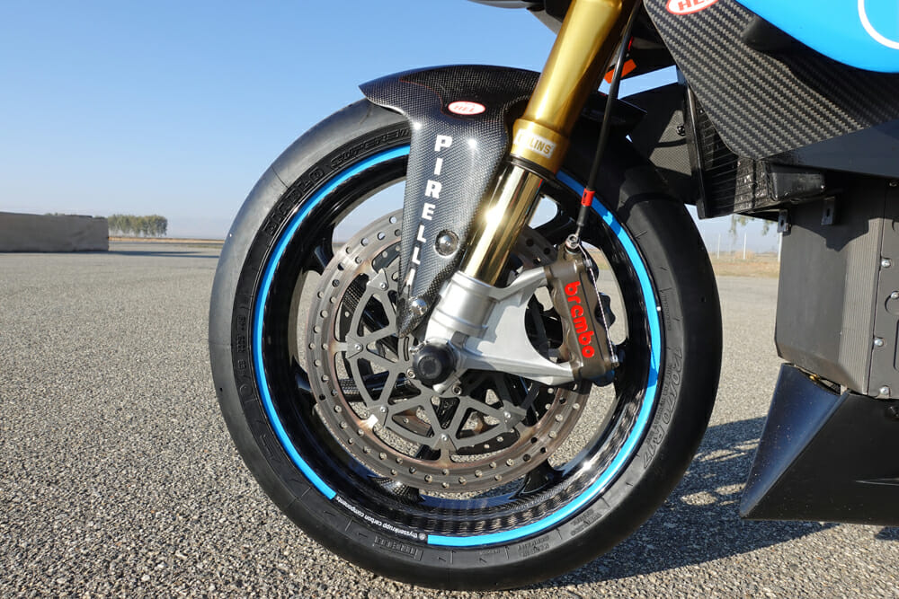 “They’re a braided carbon construction,” Wismann says of the wheels. “They’re the lightest wheel I’ve ever held or weighed. Right now, our only limitation is really that they only offer a six-inch wide rear wheel. They’re still working on narrower wheel options. We would ideally like to run a 5.5-inch for the power and weight we’re at with the Lightfighter. But we’ve been playing around with the six-inch wheel and running some various size 200-width rear tires. It affects handling a little bit, but you do get some other gains. We pick up a little bit of top speed from a higher profile tire.”