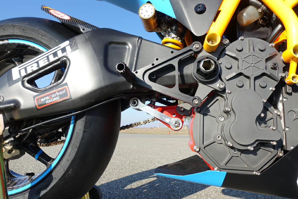 The swingarm linkages, so important in the overall concept of the Lightfighter, are custom made. “We have the stock linkage and then we have a couple of shorter linkages to play with the ride height,” Wismann says. “The bell crank position is actually on the motor itself, and it does change slightly compared to the gas-bike position. But we look at all of those influences and some suspension tuning spreadsheets and geometry packages and what we’ve got on there right now is a negative ten-millimeter link.”