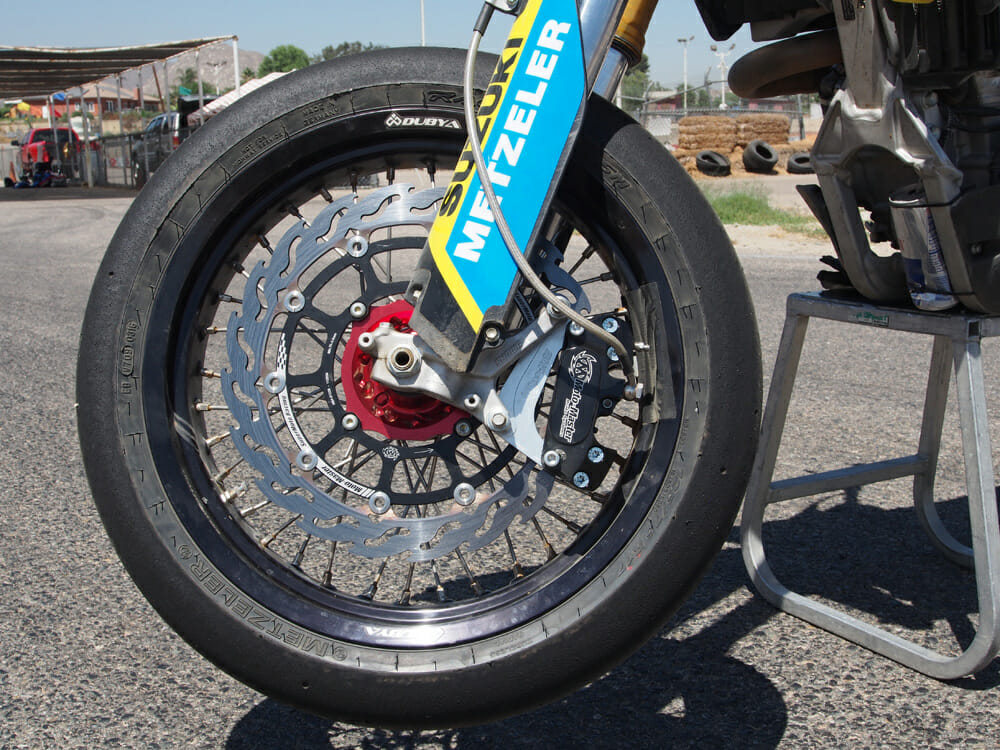 Previously, we had used Bridgestone’s V01F slick tires for our rubber, but this wasn’t the optimal setup, as they are primarily a full-on road-race tire. The carcass of this tire is quite stiff, so doesn’t perform as well as some other rubber on the market (including Bridgestone’s own supermoto tire that at the time we didn’t have access to).