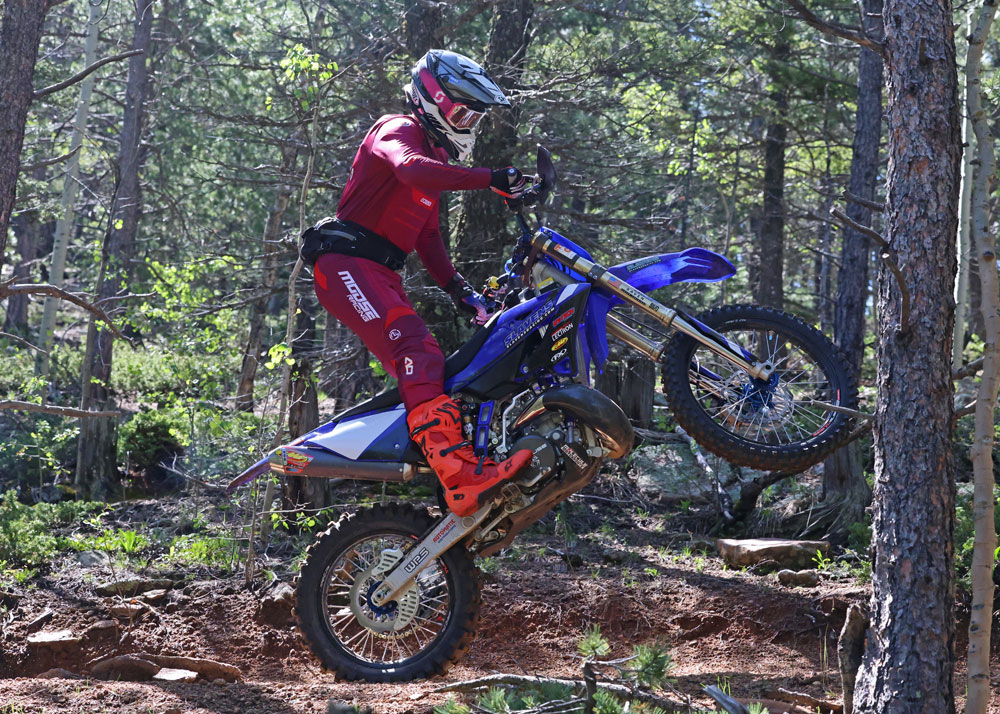 I traveled to Colorado Springs where the Slavens Racing headquarters is located and headed for the hills on the Slavens Racing Yamaha YZ300X. I was immediately impressed with the bike in many ways. The motor wowed me most. You can easily feel the boost in power and torque compared to the stock engine; gone is that high-strung “racey” feel, making the bike more comfortable and rideable on narrow trails, where precise throttle control is so critical. I loved its ability to lug when the trail turned technical, which is what makes riding a 300cc two-stroke so desirable in the first place. Overall, the bike felt plenty powerful, even at this altitude, approximately 6100 feet.