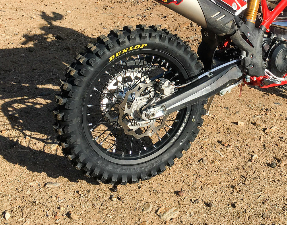We thought that the Sachs fork and shock felt a bit harsh in small chop and rocks but realized that the stock Michelin Enduro Competition FIM spec tires were the main culprit. They have very stiff sidewalls and the tires lasted forever but provided a harsh ride. We installed a set of Dunlop AT81 tires and it made a night and day difference in the compliance of the bike and traction. The forks are not great, but they are good, and most riders will be happy with them. And the Sachs shock performed well.