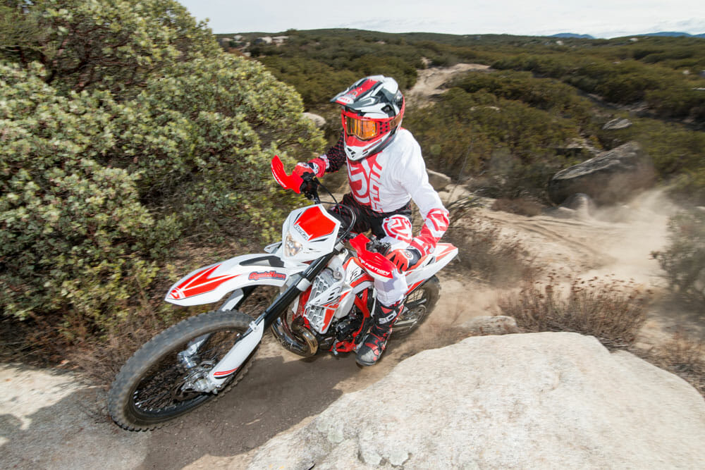 We raced the Beta at the Los Ancianos Tecate Enduro, which featured around 70 miles of tight, technical trails and several tough, rocky hillclimbs and downhills. It was nearly six hours of racing and we came away very impressed with how well the bike finds grip and tractors up technical climbs. The only casualty was the stock skid plate getting ripped off in the rocks.