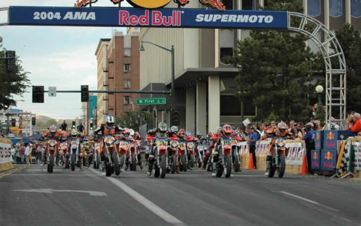 In this week’s Throwback we dial back the clock 19 years and head to downtown Reno, Nevada. This is the start of the 2004 AMA Supermoto race in Reno. Doug Henry (19) earned his second AMA Supermoto Championship victory of that season in front of 20,000 fans on the Reno Street Circuit. The race was shortened from 18 laps to 10 due to a rain delay and increasing darkness. Henry moved past Honda teammate Jeff Ward (3x) on the fourth lap. Henry then held off hard-charging German Jurgen Kunzel (52) by 1.275-seconds at the checkered flag to take the win. Ward finished third. Kurt Nicoll (31) finished fourth.