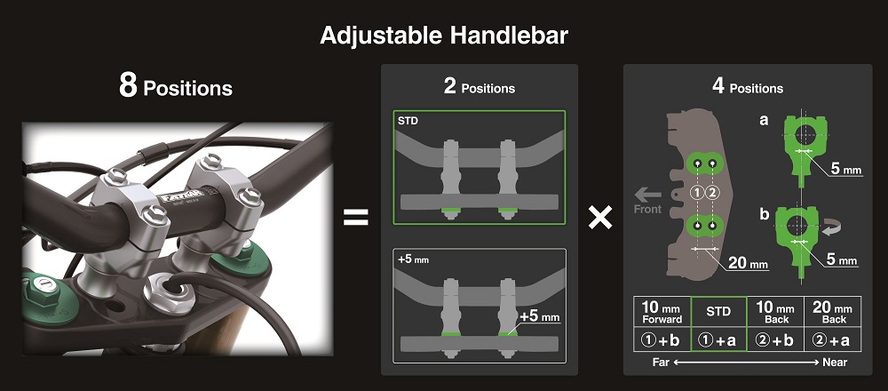 The ERGO-FIT handlebar mounts now feature an 8-position adjustable mount, giving riders the ability to fine-tune their riding position. A new upper triple clamp with two sets of handle mount slots, combined with reversible handle mounts, provides four options: 10mm forward, standard, 10mm back, and 20mm back. These positions are further complemented by two height choices using handlebar collars – standard and +5 mm – offering a total of eight possible configurations. This adjustability allows riders to create a personalized setup that suits their size, riding style, and track conditions.