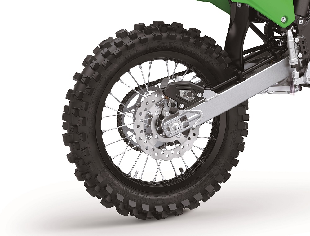 The braking system was inspired directly by Kawasaki’s larger KX machines, delivering powerful, consistent performance. Front and rear petal disc brakes offer strong heat dissipation and enhanced stopping efficiency. Up front, the brake disc diameter has been increased from 220mm to 240mm. Complementing the larger disc, the master cylinder and caliper have been upgraded to KX250-style Nissin units and utilize dual 25mm pistons. These changes significantly improve braking force, durability, and overall modulation, giving riders greater confidence when approaching high-speed braking zones.