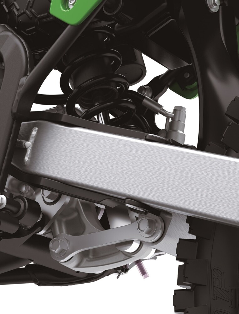 Factory-inspired details complete the cohesive styling package. A new rear sprocket design further reinforces the strong family resemblance across Kawasaki’s motocross range. Black alumite-coated rims echo the look of the factory racing team, while green alumite finishes on the fork and shock adjusters provide signature Kawasaki highlights that stand out on the track. The brushed aluminum swingarm adds to the high-quality image, delivering a polished, performance-driven look that matches the bike’s competitive capability.